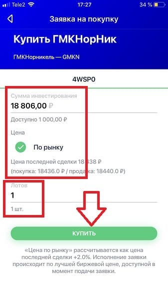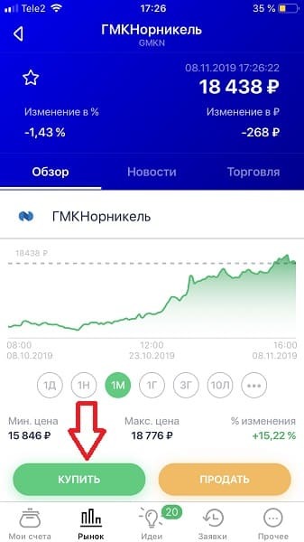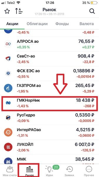 - откройте вкладку “Рынок” и в каталоге найдите ГМКНорНик (GMKN) и кликните по кнопке “Купить”;