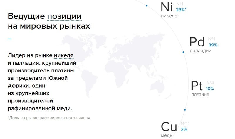 В первую очередь, компания стабильно занимает лидирующие позиции среди участников горно-металлургического производства. В частности, на отечественном рынке ГМКНорНик можно считать монополистом. В 2019 г. является единственным производителем платины (100% от рынка), помимо того контролирует: