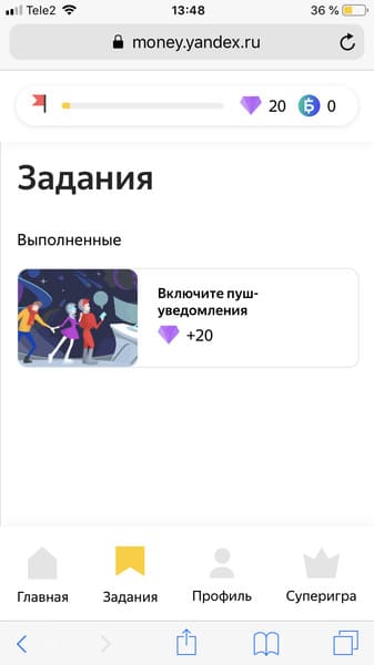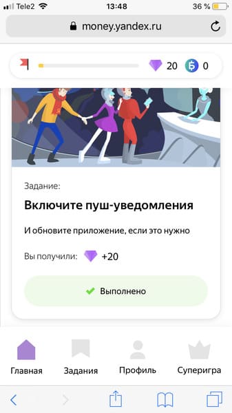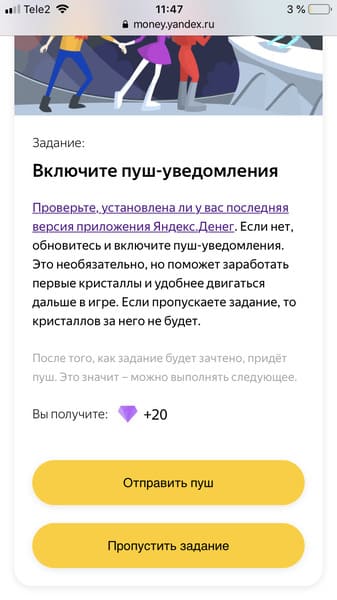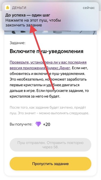 После этого вам на телефон придет push, кликните на него, чтобы подтвердить выполнение задания и получить кристаллы.