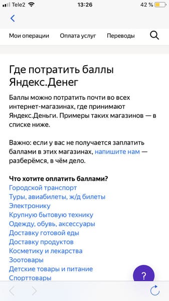 Потратить накопленные баллы можно в любых магазинах и сервисах партнеров (всего их более 500), которые принимают к оплате Яндекс Деньги. Чтобы расплатиться баллами, просто укажите способ оплаты и сколько баллов списать. Оплатить можно не более 50% от суммы чека. Например, вы решили заказать на Озоне мультиварку за 3000 рублей, из них вы сможете оплатить бонусами только 1500 рублей.