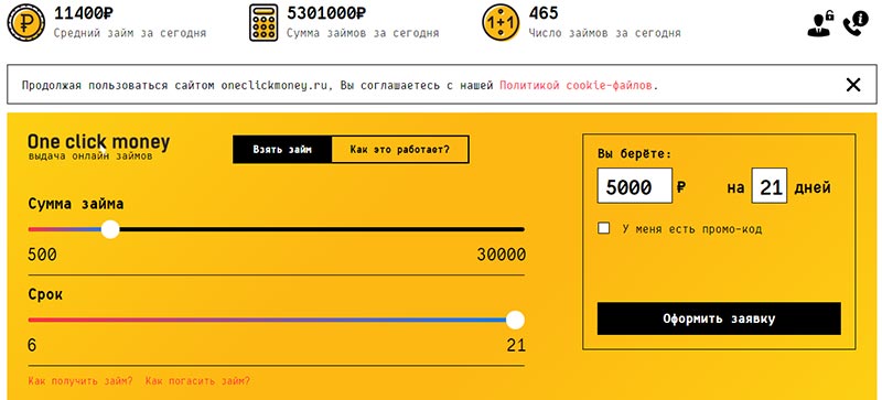 - Oneclickmoney.ru. Максимальная сумма, которую могут выдать – 25000 руб. на срок до 3-х недель под 1,5 процента. Ограничение по возрасту – до 75 лет. Займ перечисляется на банковскую карту.