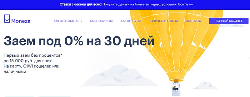 Одобрение кредита от 2 до 15 тысяч руб. Срок погашения от 5 дней до 1 месяца. Первый займ с нулевым процентом до 1 месяца. Заемщикам с плохой кредитным рейтингом должно быть не меньше 20 лет и не больше 65 лет, а наличие официального ежемесячного дохода является обязательным условием для заключения договора. Денежные средства поступают на карту, расчетный счет, QIWI, Contact. Рассмотрение заявки 15 минут. Сайт организации: moneza.ru.