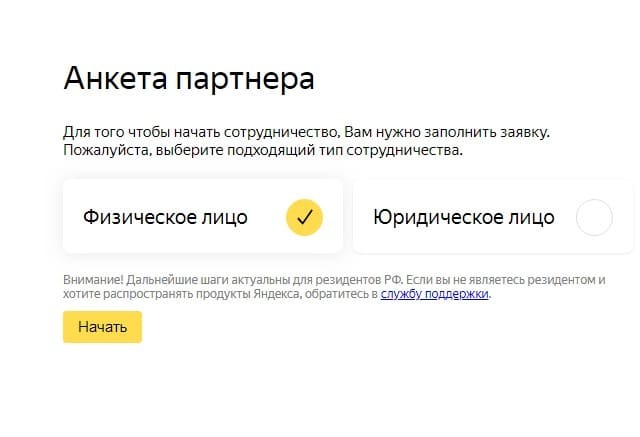 - Заполните анкету. В первую очередь выберите вариант сотрудничества – физическое или юридическое лицо и кликните по кнопке “Начать”.