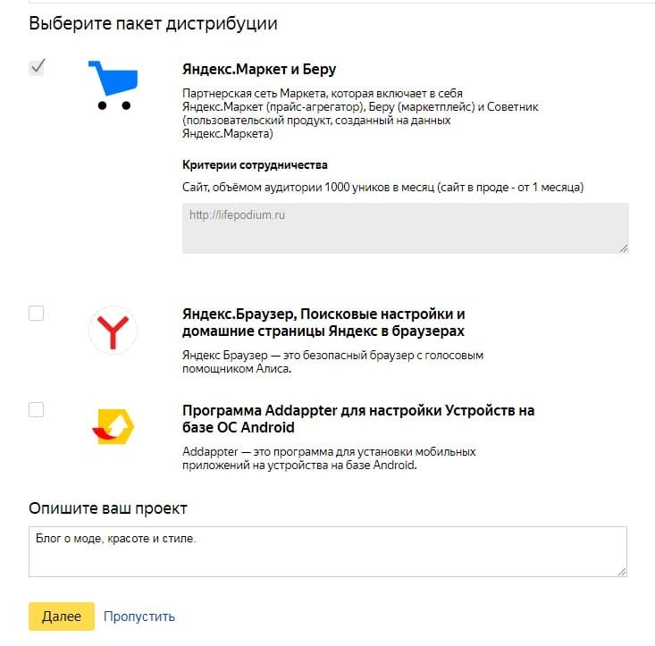 - Далее необходимо выбрать пакет дистрибуции. Здесь доступно 3 варианта: Яндекс. Маркет, Яндекс.Браузер и Программа Addappter. Далее укажите ссылку на сайт и описание проекта. После заполнения полей кликните по кнопке “Далее”.
