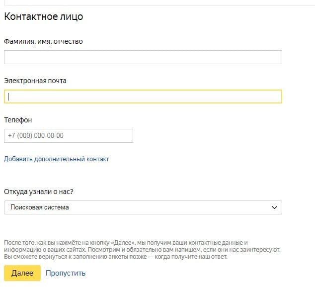- Укажите контактное лицо (ФИО, e-mail, номер телефона и откуда вы узнали о партнерке). Кликните по кнопке “Далее”.