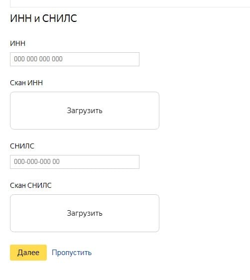 - Укажите ИНН и СНИЛС и загрузите сканы документов.