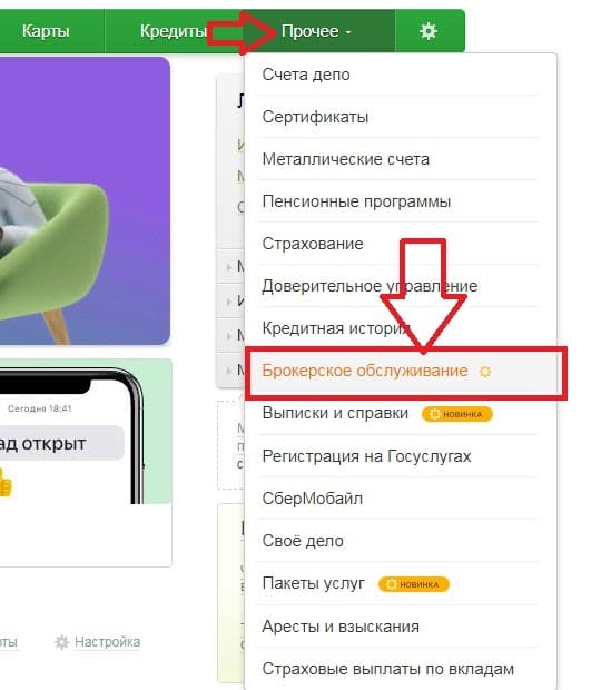 - В верхнем меню выберите раздел “Прочее”. В ниспадающем списке найдите “Брокерское обслуживание”.