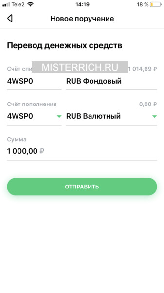 В поручении укажите счет списания и зачисления средств, а также сумму перевода. После это подтвердите поручение, нажав на на кнопку “Отправить”.