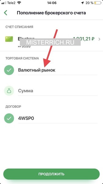 - Укажите сумму пополнения, счет, с которого будут перечислены средства и торговую площадку: валютный (для инвестиций в $ и евро), фондовый рынок (для покупки корпоративных и гособлигаций, ETF, акций), ФОРТС (для фьючерсов и опционов), ОТС (внебиржевой рынок для сделок с еврооблигациями и иностранными гособлигациями). После этого нажмите на кнопку «Продолжить».