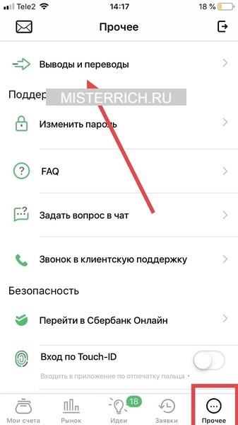 Что же делать, если вы зачислили деньги не туда, куда нужно и вам требуется перекинуть средства, к примеру, с фондового рынка на валютный? Такая функция доступна в терминале “Сбербанк Инвестор”. Войдите в торговый терминал “Сбербанк Инвестор”. Перейдите на вкладку “Прочее” > “Выводы и переводы”.
