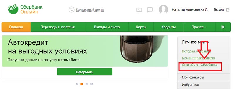 - Шаг 2. Зайти на вкладку «Спасибо от Сбербанка» (вы увидите ее справа).