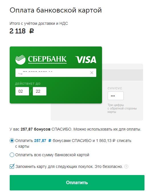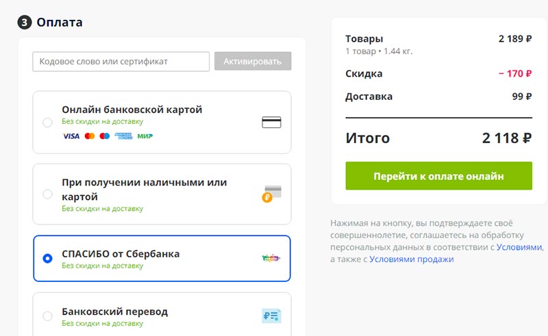 - Выбираем способ оплаты «Бонусы Спасибо»;