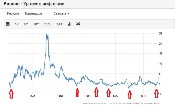 В Японии в 90х годах наблюдалась глубокая дефляция, получившая известность как «Потерянное десятилетие».
