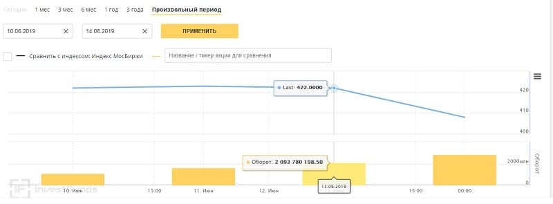 Вот как это выглядит на графике на примере выплаты дивидендов компанией Роснефть. На дату отсечки 13 июня 2019 года ценные бумаги торговались на отметке 422 рубля, на следующий день цена упала до 408 руб. Дивидендные выплаты составили 11,33 руб. Восстановление цены до прежнего значения произошло после 20 июня. (то есть примерно через неделю).