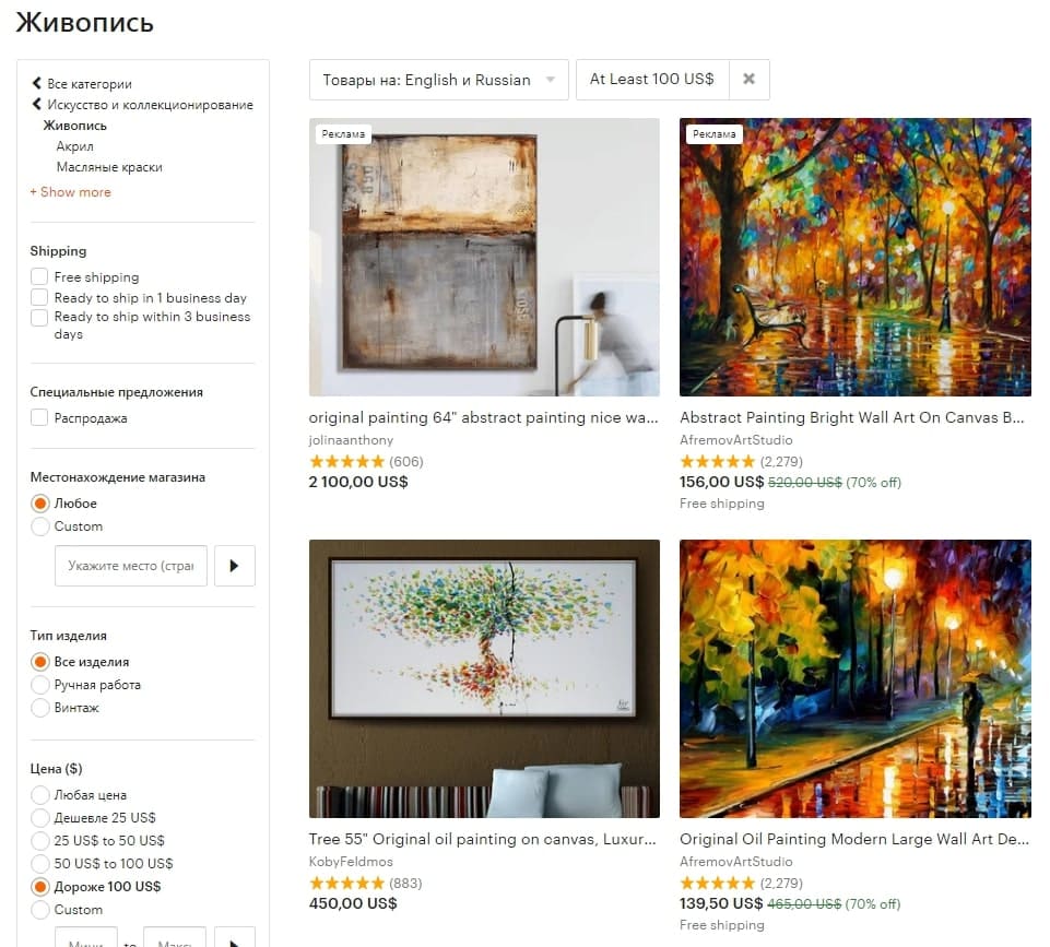 ETSY – международная площадка для продажи своих работ. Картины можно продать в США, Европу и даже Австралию. Следует обратить внимание на этот ресурс, так как зарубежные покупатели ценят ручную работу и готовы заплатить хорошие деньги за качественную картину. В каталоге представлена живопись нескольких типов: акрил, акварель, масляные краски, комбинированные, гуашь, энкаустика, Ink.