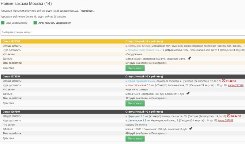 Подрабатывая курьером, можно в день с легкостью зарабатывать от 1000 до 3500 рублей. Такой вид заработка особенно востребован в Москве, Санкт-Петербурге, Краснодаре. Найти заказы вы сможете на специализированных биржах курьеров, таких, как: