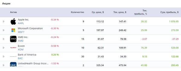 В подразделе «Состав портфеля» отображается таблица с основными показателями доходности – вклад актива в общую доходность, изменение цены за день, доля в общем объеме инвестиций.