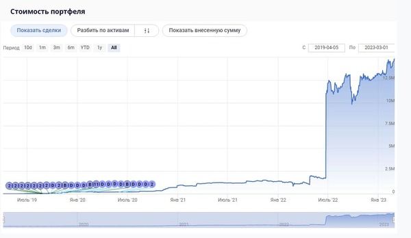 | Стоимость портфеля | Диаграмма изменения общей стоимости и суммарной, с количеством совершенных сделок и датами выплаты дивидендов |