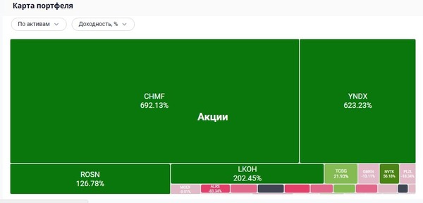| Состав портфеля | В виде диаграммы состав с указанием долей в процентах и рублях. Отдельно можно посмотреть по каждому типу активов |