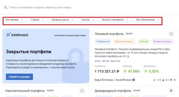 Сервисом пользуются более 300 000 инвесторов РФ и стран СНГ. С помощью поисковой строки и системы фильтров вы смоете найти портфель по названию, инвестору, тикеру или заданным характеристикам.
