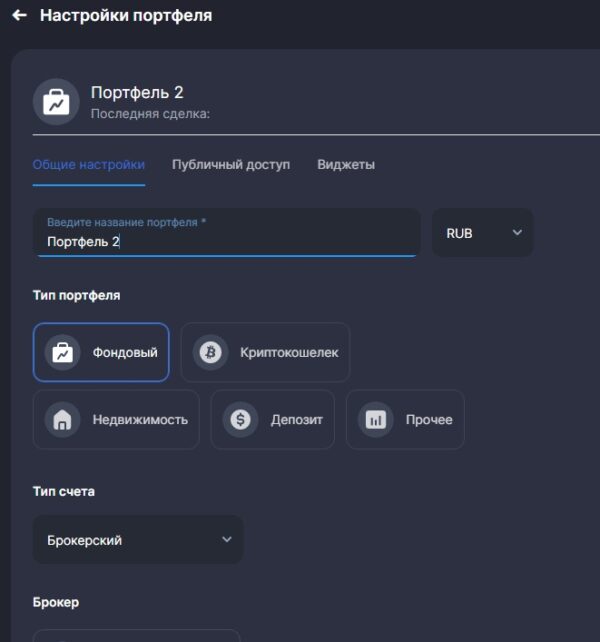 - Выберите тип – закрытый или публичный. Публичный позволяет размещать баннер с данными о сделках на других сайтах. Перечень данных для демонстрации инвестор настраивает сам.