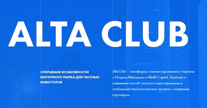 - AltaClub – проверенный ресурс, сосредоточенный на соинвестировании в стартапы, отобранные представителями клуба AltalR Capital. Частное инвестирование еще никогда не выглядело настолько легко и предсказуемое – надежный партнер, проверенная репутация, помощь новичкам и технологии, способные приносить от 25% вложенной прибыли ежегодно.