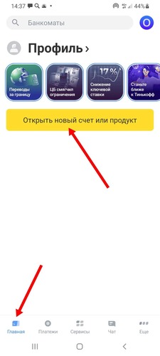 - Перейдите в раздел “Главная” и нажмите на кнопку “Открыть новый счет или продукт”.