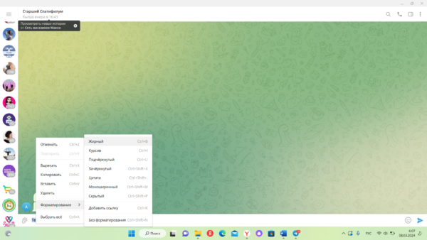 Работая с компьютера, в телеграмме можно изменять шрифт как через меню, так и через использование горячих клавиш.
