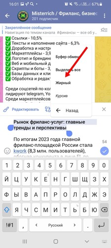 В телеграмме используются и другие варианты начертаний. Выбрать их также можно из контекстного меню, сделать с помощью горячих клавиш (Ctrl + другая кнопка) или специальных символов. Последний способ подходит не для всех видов форматирования.