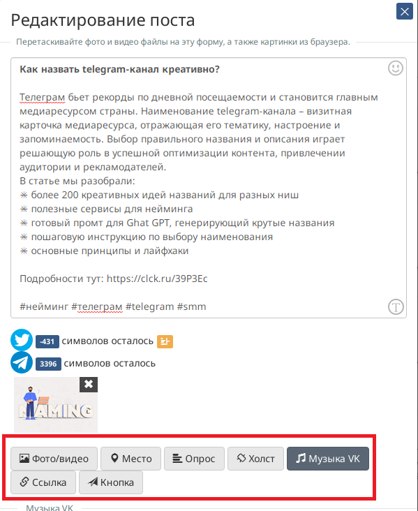 Для выделения жирным используйте комбинацию Ctrl+B. С помощью этого сервиса также можно добавить к посту опрос, ссылку, кнопку, фотографии.
