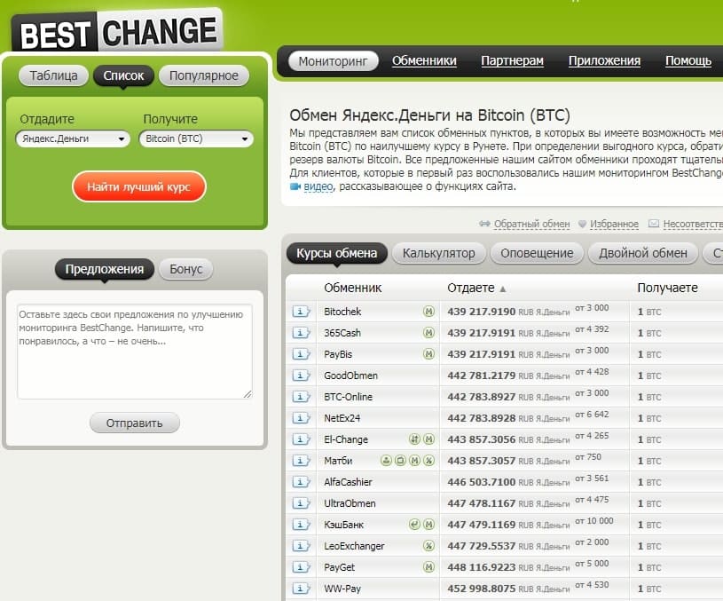 BestChange – сервис, позволяющий сравнивать обменники и помогающий пользователю найти сайт, предлагающий максимальную котировку. Так же на сервисе сразу указывается резерв криптовалюты по выбранному обменнику. При необходимости можно ознакомиться с отзывами реальных пользователей.