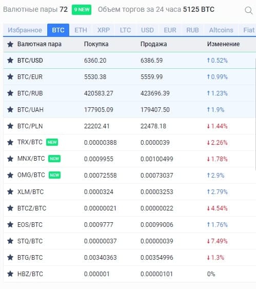 - Подбор валютной пары. На «Эксмо» всего существует 12 разновидностей криптовалют. В качестве пары можно выбрать рубли и биткоины, так же существуют лайткоины, эфиры, догкоины и многое другое. Если вы не обладаете информацией о каждой валюте, то лучше не рисковать.