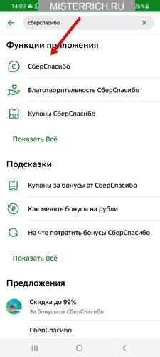 - В поисковой строке введите “СберСпасибо” и перейдите в этот раздел.