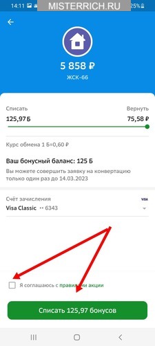 - Поставьте галочку напротив пунка о согласии с условиями программы и нажмите на кнопку “Списать”.