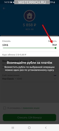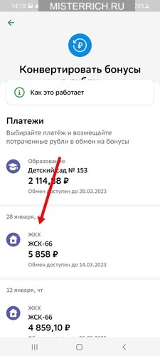 Чтобы конвертировать накопленные бонусы в рубли за совершенный платеж за услуги ЖКХ, выполните следующие действия: