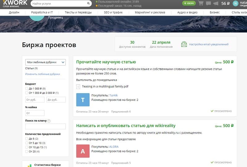 - Чтобы просматривать доступные предложения от заказчиков, перейдите в раздел “Биржа проектов” по ссылке https://kwork.ru/projects.