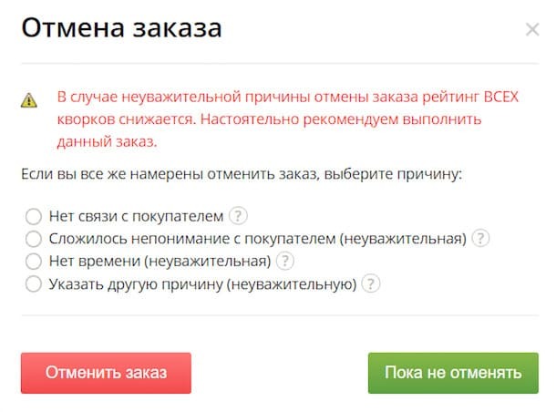 Перед выбором придется указать причину, которую биржа выставит в «неуважительном» или «уважительном» ключе. Та же нехватка времени не станет поводом для безболезненного отказа, а вот проблемы со связью еще могут посчитать поводом для возвращения потерянного рейтинга.