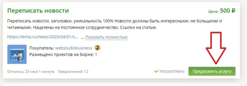 - Просмотрите доступные предложения. Обратите внимание на строки “Осталось (времени)” и “Количество предложений”. Кликните по кнопке “Предложить услугу”, расположенную рядом с понравившимся кворком.