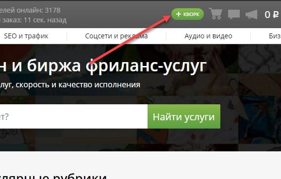 Добавлять услуги на биржу разработчики Кворк предлагают через специальную кнопку «Кворк», расположенную в верхней части интерфейса, рядом с контекстным меню личного профиля.