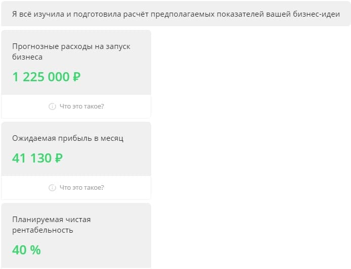 - После выполнения расчетов вы сможете сохранить бизнес-план в личном кабинете или скачать его на компьютер. В этом проекте вы получите всю важную для стартапа информацию: сумму первоначальных инвестиций, срок окупаемости вложений, рентабельность продаж, перечень необходимых документов для открытия бизнеса в выбранной нише и многое другое. Если выбранная вами идея нерентабельна по выбранному адресу, то вы увидите в этом приложении соответствующее уведомление.