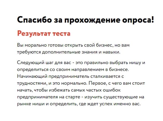 После прохождения текста, вы получите результат о вашей готовности к предпринимательству.