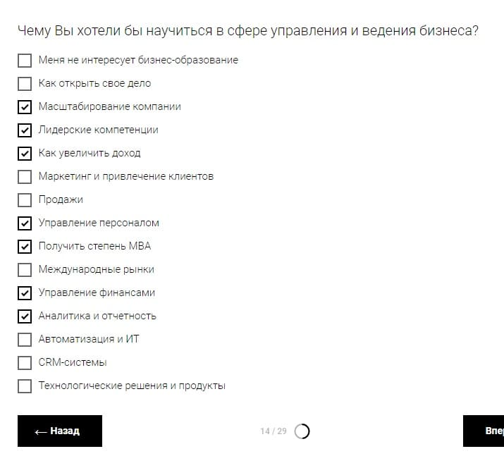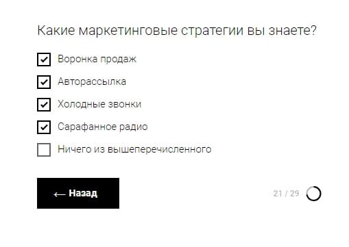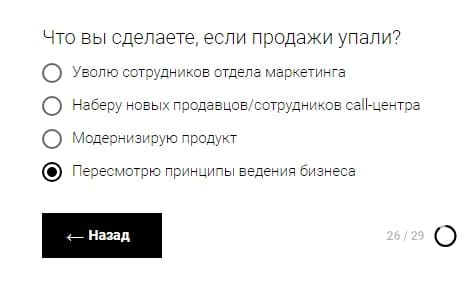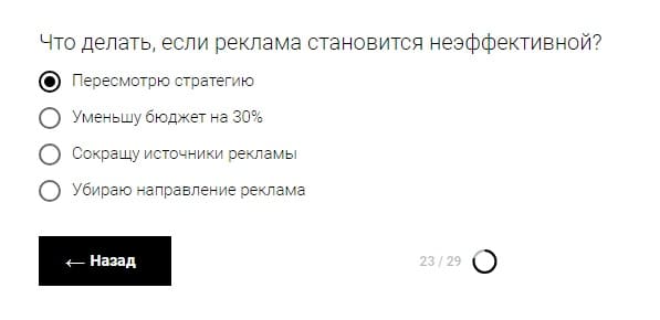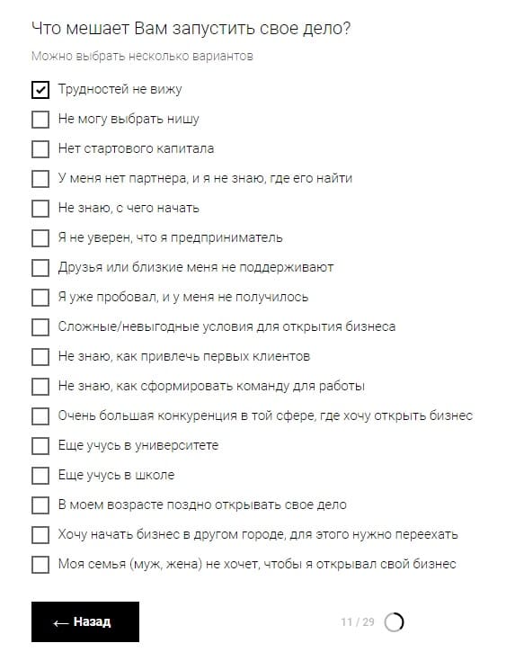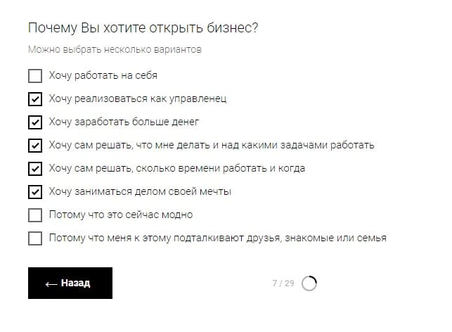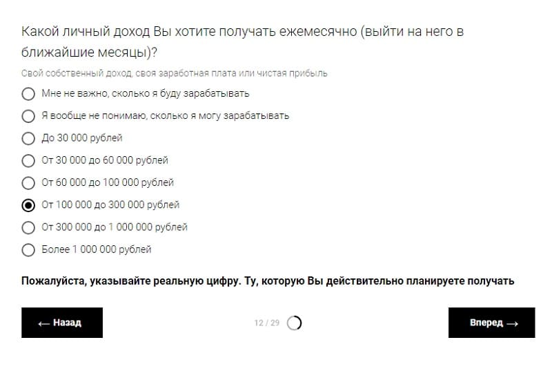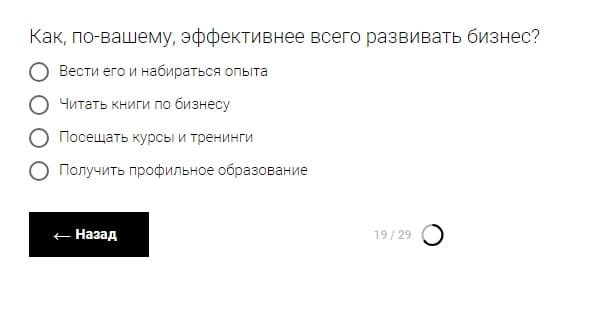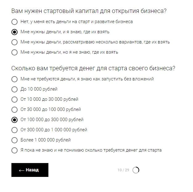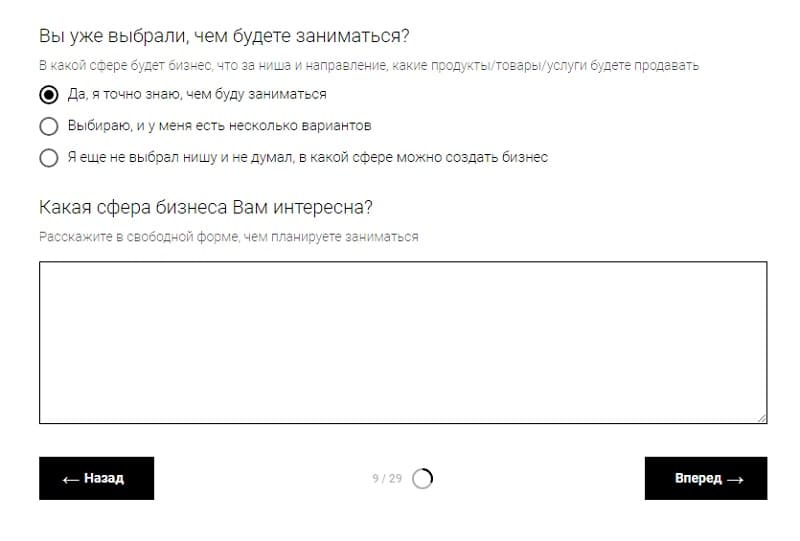 Чуть ближе к финалу тестирования появятся более узконаправленные вопросы – о том, какая ниша выбрана, сколько денежных средств понадобится на развертывание проекта и понадобится ли дополнительные знания и советы от тех, кто уже достиг серьезных результатов.