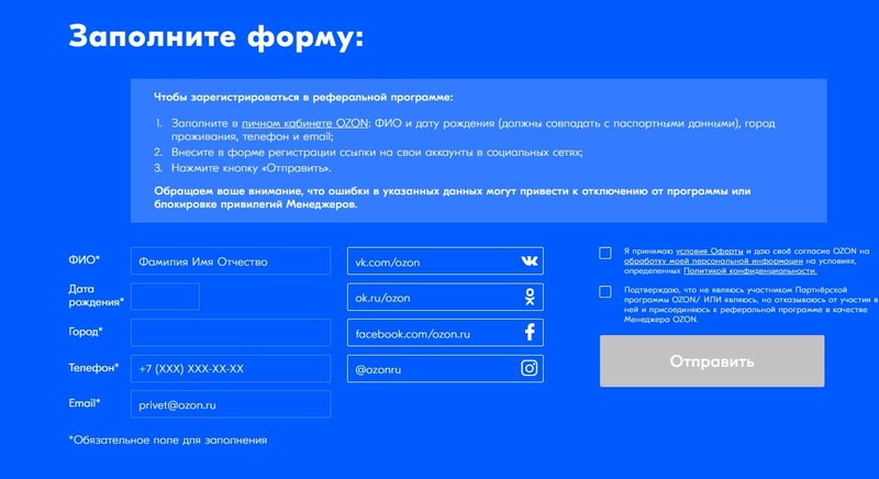 Для проведения регистрации в партнерке от OZON нужно пройти по ссылке на сайте и заполнить анкету. В ней потребуется указать информацию о себе, пароль и предоставить адрес электронной почты.