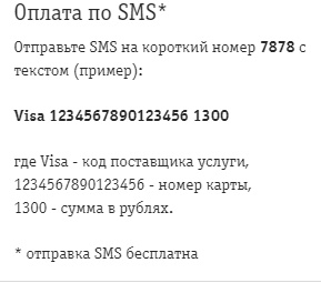 - Перешлите СМС на номер 7878 с информационными данными: тип карточки (Виза, Маэстро и так далее) номер пластика, сумму в рублях. Все сведения необходимо писать через пробел.