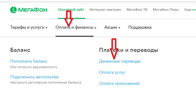 - Перейдите на портал megafon.ru → раздел “Оплата и финансы” → Вкладка “Денежные переводы”.