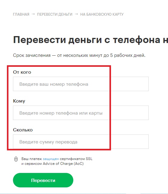 - Необходимо будет правильно указать в выделенное поле номер пластика, указать сумму перевода и мобильный номер.