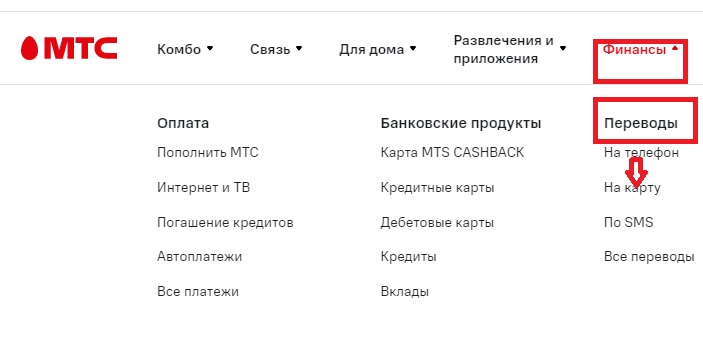 - Перейдите на сайт МТС. Кликните в верхнем меню по вкладке “Финансы”. Выберите “Переводы” → “На карту”.