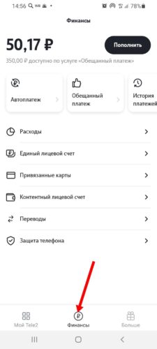 - Скачайте приложение “Мой теле2” и войдите в него. Перейдите на вкладку “Финансы” и выберите раздел “Переводы”.