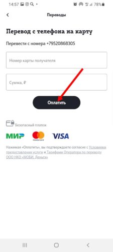 - Укажите номер карты получателя и сумму. Затем кликните на кнопку “Оплатить”.