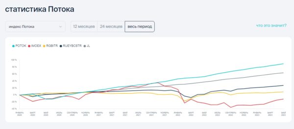Как мы видим на скриншоте, доходность проекта “Поток” за 3 года (с 2020 по 2023 года) составляет 89,51%. За аналогичный период индекс МосБиржи (IMOEX) продемонстрировал минус 11,7%. Индекс гособлигаций за тот же временной отрезок вырос на 8,71%. На графике мы видим, что, когда фондовый рынок в панике падал, сервис частных займов продолжал расти. Это доказывает тот факт, что этот инструмент можно использовать в качестве альтернативных инвестиций. Однако важно учесть, что инвестиционная платформа весьма молодая и не может гарантировать аналогичную доходность в будущем.
